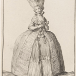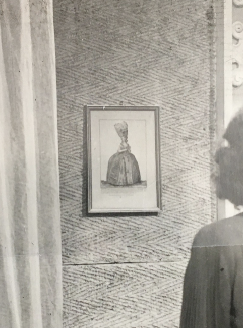 Aménageant et décorant son intérieur, comme elle sait d’ailleurs décorer son corps de tenues de soie, satin, jupes et blouses aux coupes travaillées et plis soleil, Madame Moreil choisit pour son intérieur une icône apotropaïque interessante pour protéger son foyer, disposée proche du lit conjugal, et veillant sur elle, sur son rôle de femme. Il ne s’agit pas d’une icône religieuse, mais bien d’une icône de mode. Cette icône n’est autre qu’une gravure de mode du XVIIIe siècle, tirée d’un des périodiques les plus célèbres de l’époque: La Galerie des Modes. Ce périodique propageait l’image de la grandeur française, de son goût, et, déjà, signait cet empire de la mode française à la fin du XVIIIe siècle. La gravure présente une femme, regardant sa spectatrice, elle est vêtue d’une grande robe unie de cérémonie, à paniers, de taffetas des Indes, et dont d’ailleurs le goût des plis travaillés, partagée avec sa protégée, apparait dans les falbalas plissés du manteau de robe et de la jupe.