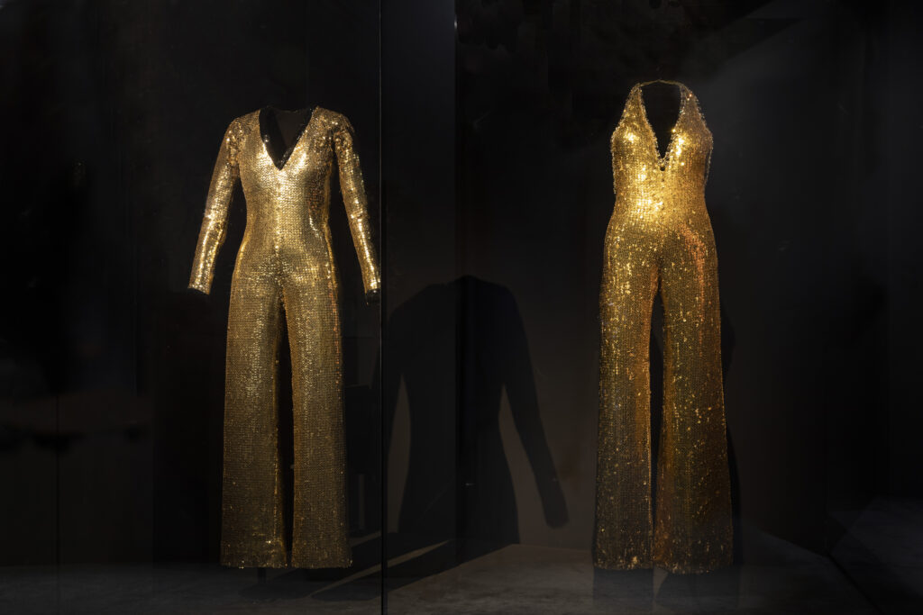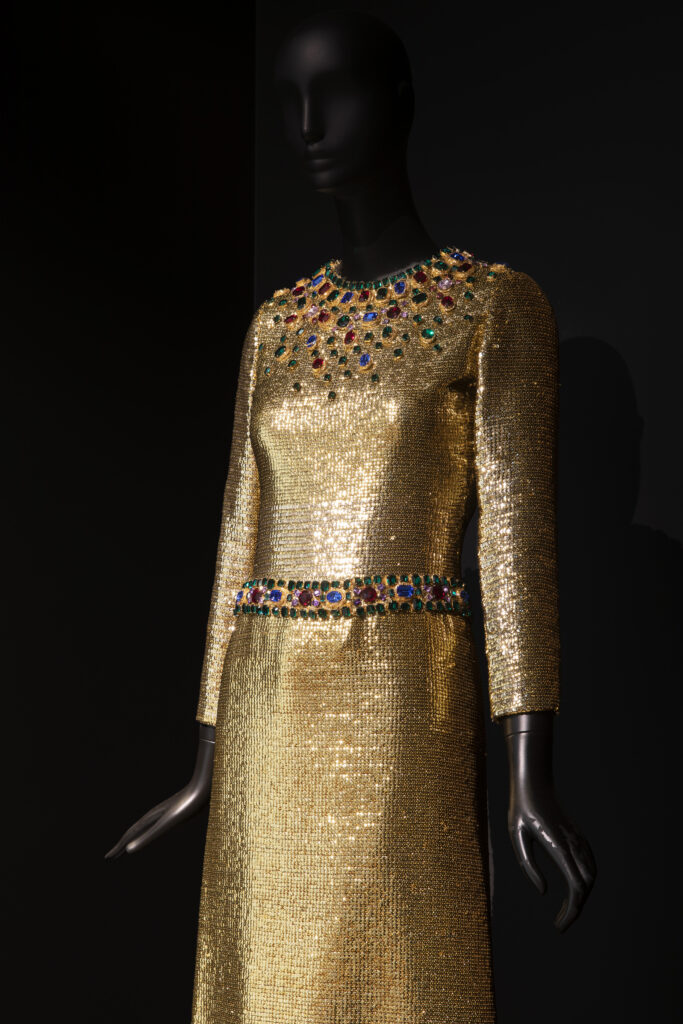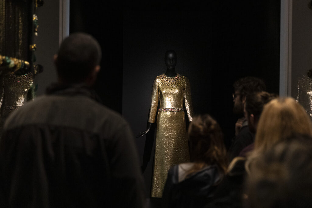 Ainsi, plus d’une quarantaine de robes haute couture et prêt-à-porter et une sélection d’accessoires et bijoux en vitrines sont dévoilés au sein du bâtiment du 5 avenue Marceau, qui a longtemps abrité la Maison de haute couture. Sous le commissariat d’Elsa Janssen, directrice du musée depuis mars 2022, l’exposition retrace le parcours doré des collections de Monsieur Saint Laurent : « Des tout premiers boutons ponctuant les cabans aux robes entièrement dorées, aucune collection n’échappe à la touche « or » du couturier. Toutes matières se prêtent à ces éclats : brocarts, dentelles, lamés, sequins, cuirs, broderies… Tissus, bijoux, parfum, l’or scintille… »