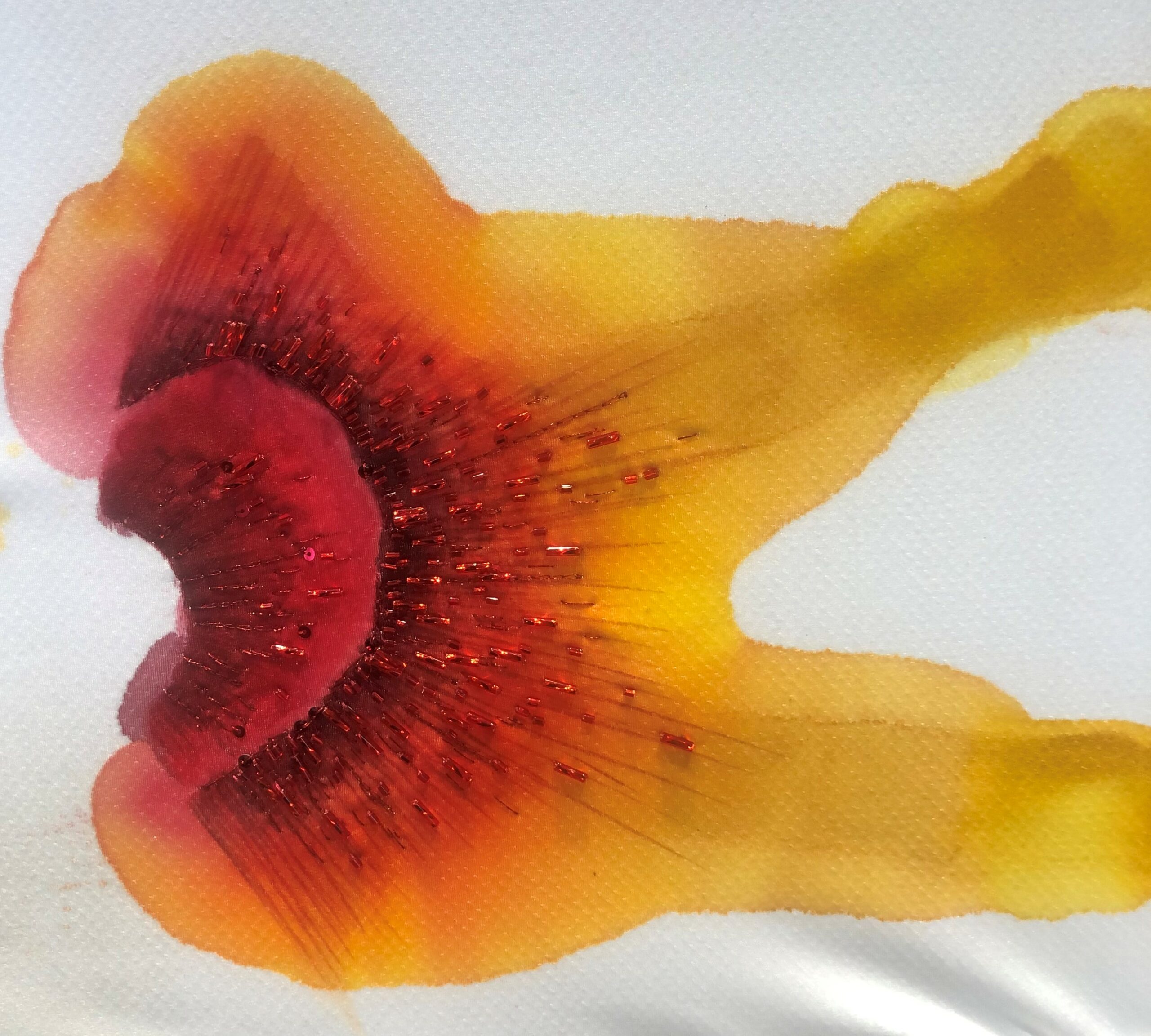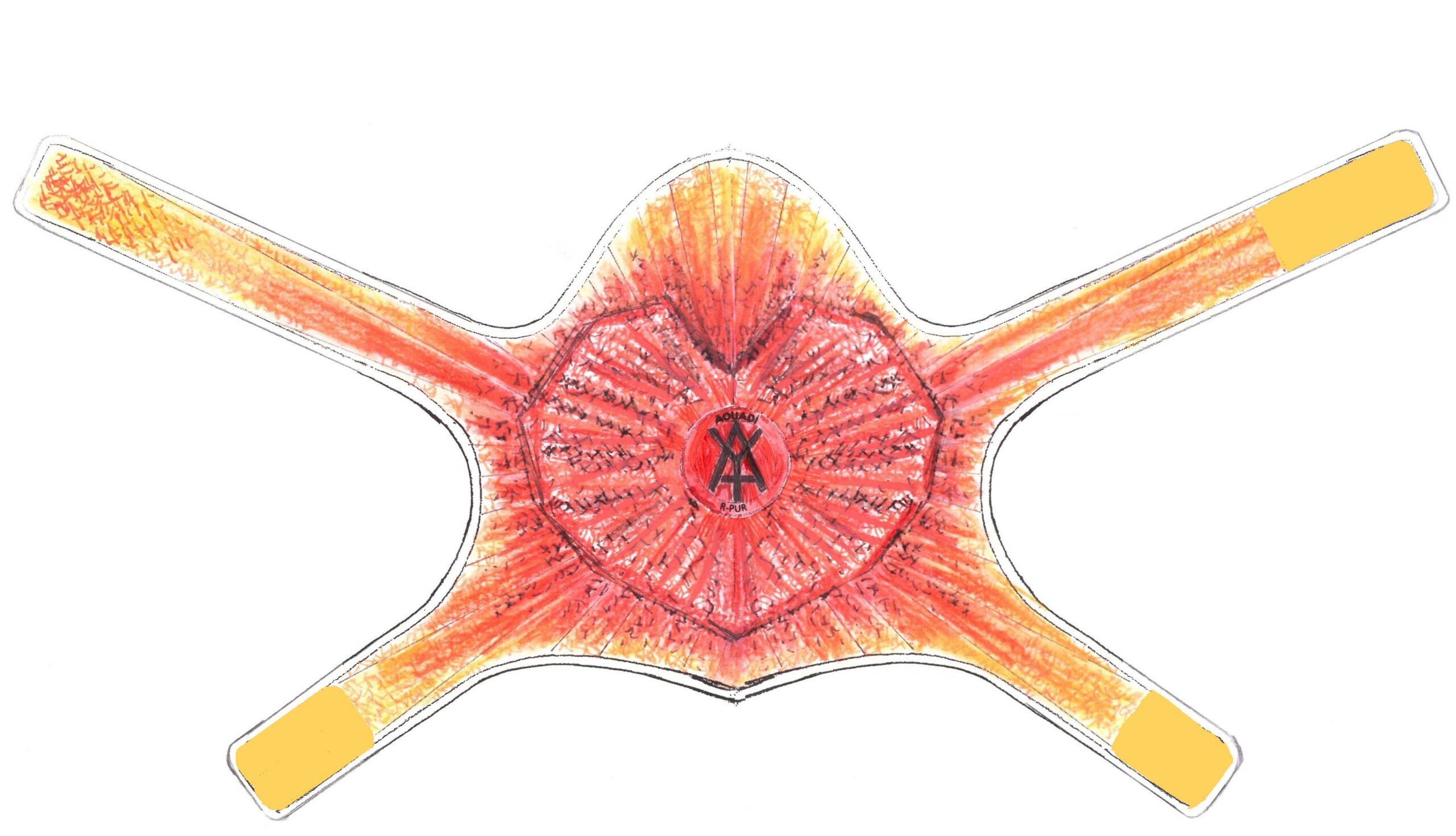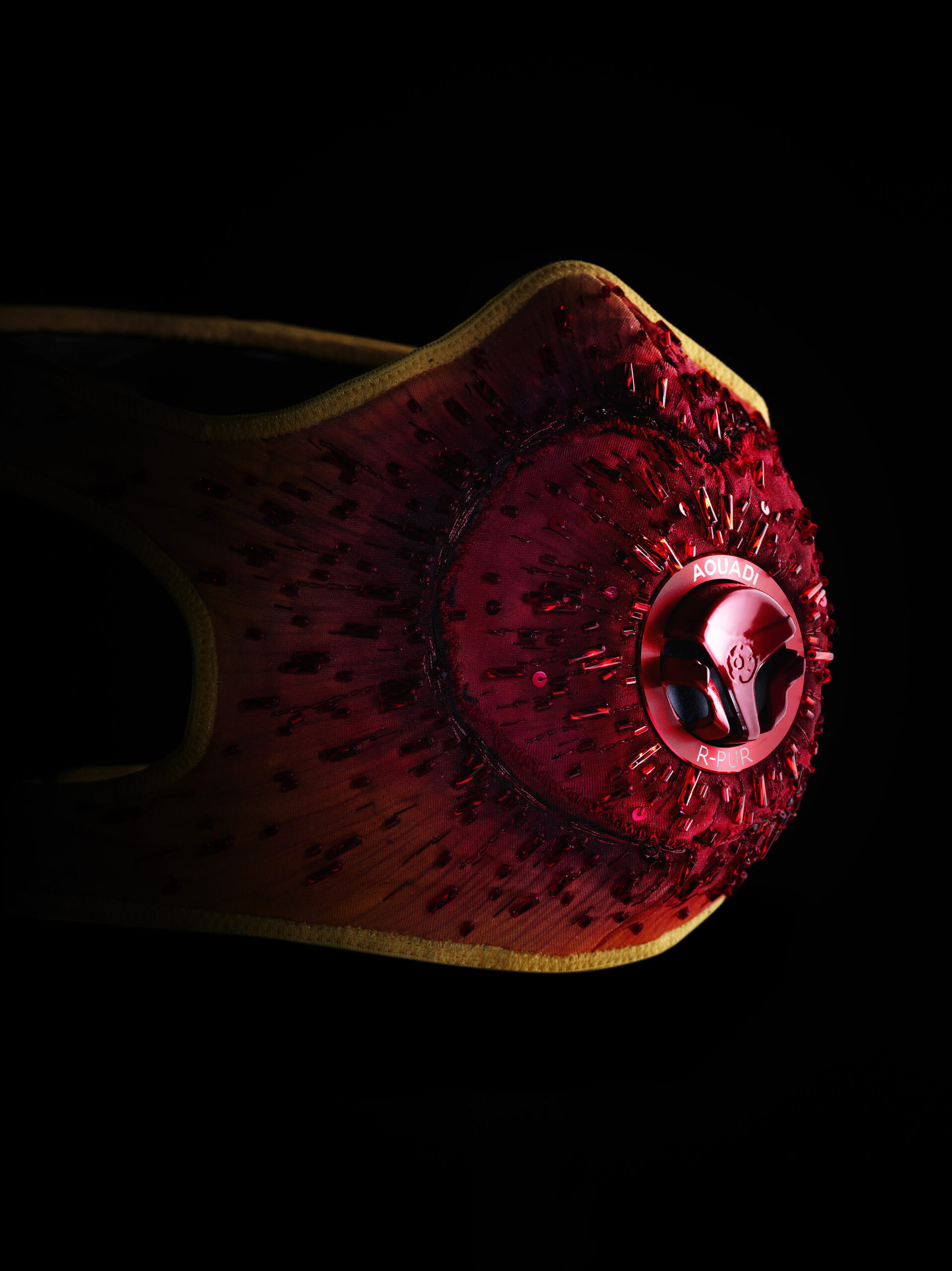 Masque « Cœur Ardent » en tissu déperlant Thermo-Control® peint à la main en nuancier. Broderie constellation de perles vermeil et cœur de lurex incandescent. Valve d’extraction d’air et bague sérigraphiée en aluminium renforcée anodisé incarnat. Filtre hermétique R-PUR Nano®. Broderie calligraphie au revers, handmade in paris , numeroté 1/1. Acquisition du fonds de dotation.