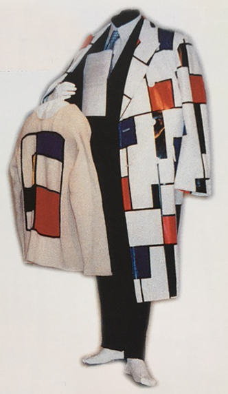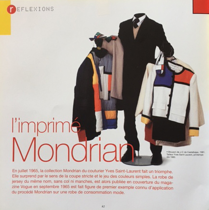 En juillet 1965, la collection Mondrian du couturier Yves Saint-Laurent triomphe. Elle surprend par le sens de la coupe et le jeu des couleurs simples. La robe de jersey du même nom, sans col ni manche est alors publiée en couverture du magazine Vogue en septembre 1965 et fait figure de premier exemple connu d’application du procédé Mondrian sur une robe de consommation mode.