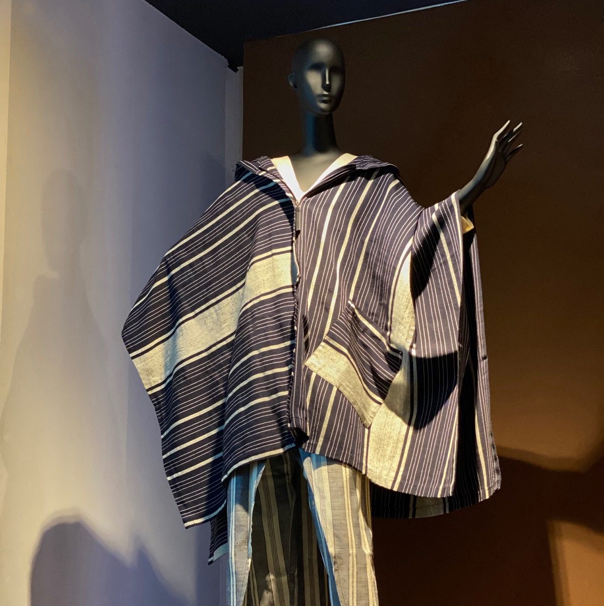 – Un barnous : d’origine berbère, cette longue cape à capuche pour homme présente des similarités avec les kimonos masculins japonais. Mon Barnous est en lainage léger de petite laize correspondant à la largeur du métier à tisser. La longueur a été raccourcie, la capuche surdimensionnée. J’ai créé un jeu visuel par le changement de direction des rayures.